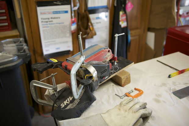 Para limpiar el frente de la hoja (la curva en el borde) y el dos ángulo cortes en la parte superior de la columna vertebral utilicé una lijadora de banda que he hojeado por encima y cremallera atada y sujeta al Banco de trabajo. No tengo una lijadora de banda real como