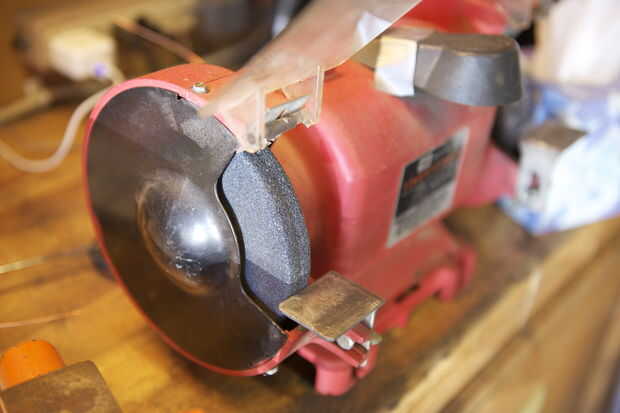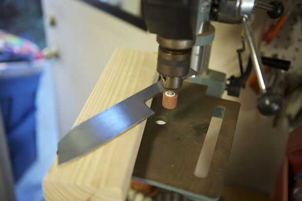 Para limpiar la manija y el borde posterior de la hoja usé un poco de lijadora de tambor en una prensa del taladro, un tambor de lija de la dremel y una esmeriladora de Banco superior.