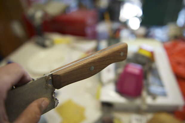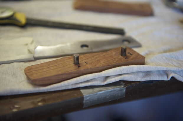 A continuación pega el cuchillo de metal en la primera escala con las clavijas y sujeta en su lugar.