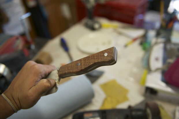 Una vez que el mango se siente bien en sus manos, lijar todas las piezas de madera de la manija con papel de lija progresivamente mayor hasta tan liso como desee. No fui más allá de grano 600.