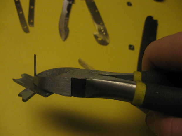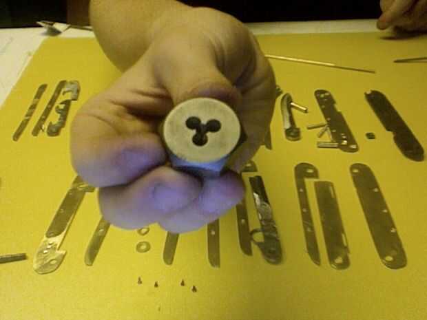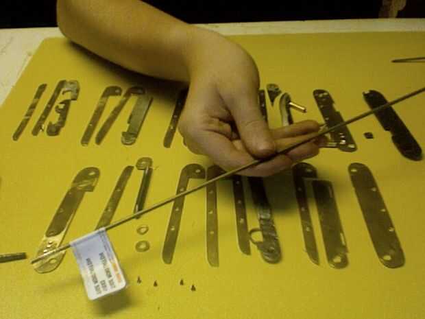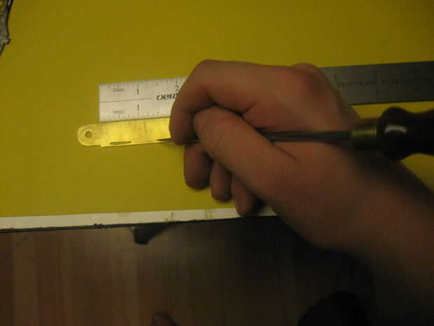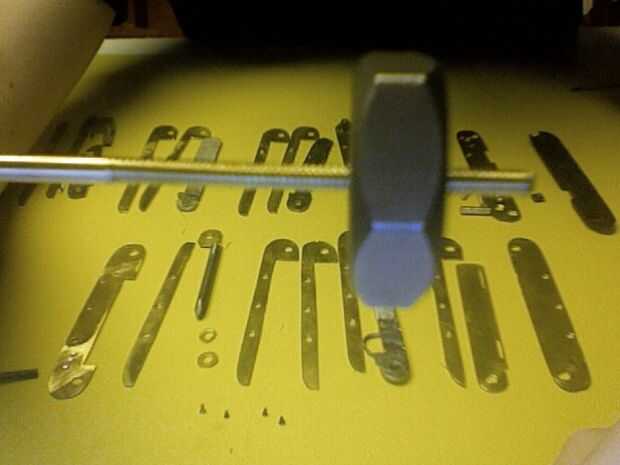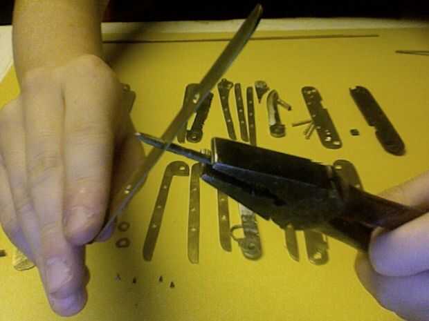 En este paso se realiza algunas pequeñas alteraciones a las piezas, empezando con el archivo usted puede haber notado que se hace de dos piezas. He hecho esto era porque el archivo fue hecho del acero de herramienta bruja tiene un alto contenido de carbono y es un tratamiento térmico y no fui capaz de perforar, así que hice un inserto de acero suave con una cola de Milano común (que es básicamente lo que ves en un rompecabezas de Sierra de calar). El relleno era más grande entonces por martilleo resultó en un ajuste apretado. la muesca en el archivo se puede hacer con una dremel. Siga con la fabricación de la ranura de clavo de dedo pulgar que esto se puede hacer con un disco de corte. Las tijeras son una de las partes más difíciles para iniciar con la perforación de un 1/16 agujero en el centro de piezas y fregadero contrario el orificio con un 8 bit en ambos lados, luego utilizar un 1/16 cabeza clavo liso cortado a 1/8 más y luego las dos piezas de metal y martillo y archivo dando por resultado un remache liso , y para el destornillador Phillips comienza por cortar un destornillador barato con un dremmel luego coloque el disco de corte en una prensa del taladro y usarlo para cortar una muesca siga que con perforación de 1/16 orificios que deben ser avellanados con un 1/8 bits. luego realizar una latón introducir dentro el destornillador de acero y dos orificios en el enganche luego terminarlo con dos remaches como las tijeras. Para el cuchillo y otros bordes afilados, utilice un archivo o una lijadora de banda para activar el borde plano a un borde afilado. Algunos de lo elemento son complejas y no se pueden cortar con la dremmel, por lo que se pueden cortar en el interior con una sierra para metales y archivo. Para conectar todas las piezas de latón fijo es mejor usar barras de thredded a lo largo de la parte inferior, para el uso de la barra un dado del hilo de rosca y tornillo simplemente en como una tuerca y en cuanto a los agujeros roscados, usar un grifo de rosca los tres agujeros en la parte inferior de las piezas de latón. Para la regla grabar el la pieza de latón con un escribano. Finalmente al lado de las tijeras 1/16 arandelas son requerido hacen por dos agujeros cortan el exterior. Una vez que tengas las paces podría endurecer el acero por calentarlos con un soplete de propano luego wen calentada coloca en un recipiente de metal abierto con agua rápidamente enfriar el metal, lo que es más difícil pero ten cuidado que esto cambie un poco la forma y el tamaño del metal para no calentar directamente el punto de bisagra o el latón. Cuando haya terminado de endurecer el metal compararla con la guía de papel y archivo al tamaño correcto. Final se Loos wen trabajo con herramientas y la antorcha y no se hará responsable ni de las lesiones.