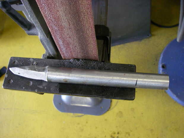 a la lijadora de banda. Primero forma el contorno de la hoja, luego que los biseles de la hoja de tierra y áspero había afilada lo. Guardé la hoja húmeda y mantienen sumergiendo la hoja en el agua. No sobrecalentar y decolorar la hoja a todos.