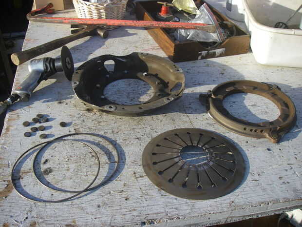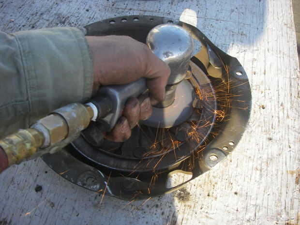 Estoy usando un disco de corte abrasivo para cortar los remaches que sujetan el conjunto. Cada placa de presión se hace diferente. Ten cuidado. Puede haber algunas partes con resorte que pueden saltar en usted o enlazar su herramienta.