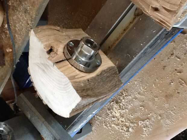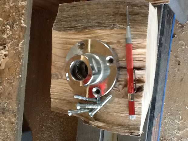 Después de que los agujeros se perforan es hora de montarlo en la placa frontal. Esto es tan simple como atornillar al espacio en blanco. Luego montarlo en su torno.
