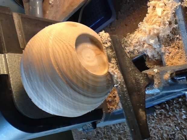 Empezar por desbaste exterior del tazón de fuente. Hacerlo como redondo como sea posible. Al principio tienes que empezar muy lento la velocidad del torno... De lo contrario las cosas en su banco va a bailar en el lugar. Las vibraciones pueden ser violentos.