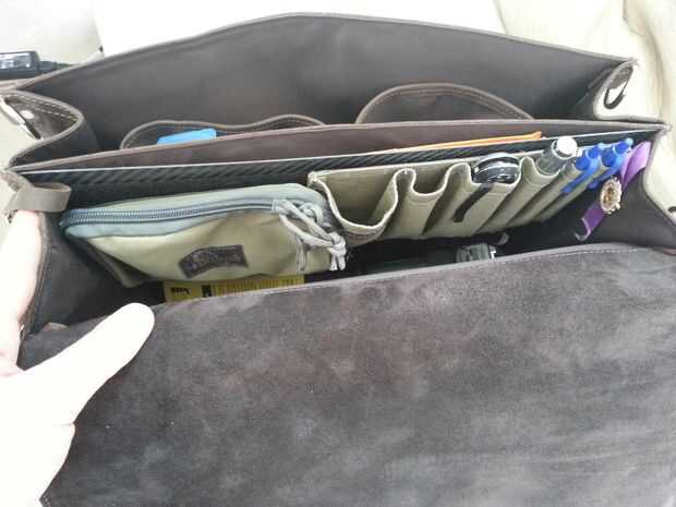 Esto muestra la placa como en el caso. Intencionalmente dejé la parte superior de la placa individual de divisor de centro de la bolsa tan delgadas carpetas y documentos podrían ser se deslizó en allí con seguridad. La placa es un ajuste deslizante en lugar solamente por la fuerza de pellizcamiento de la piel como se trata de juntas en las uniones donde las paredes laterales encuentran el divisor de centro, por lo que se puede quitar en cualquier momento para aplicar nuevas bolsas o mover cosas.
