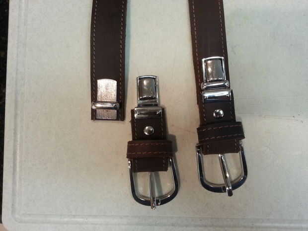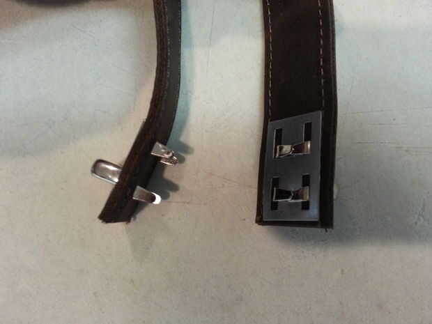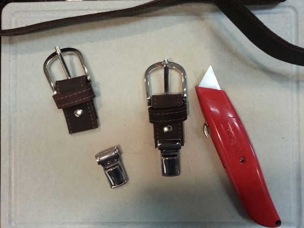 Me tiró de las correas de la bolsa y utiliza un cuchillo para cortar justo por debajo de las hebillas. Realmente quité a 4 pulgadas de la longitud de las correas para que no cuelgue es tan larga. El lado macho de la aldaba montado en el lado corto de la hebilla de la correa y el lado femenino al resto de la parte larga de la correa.