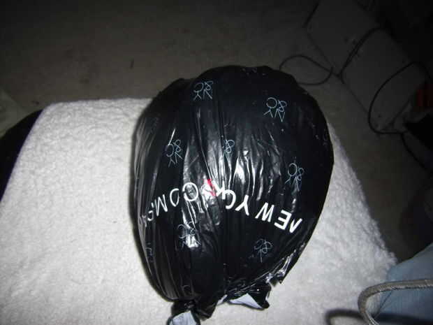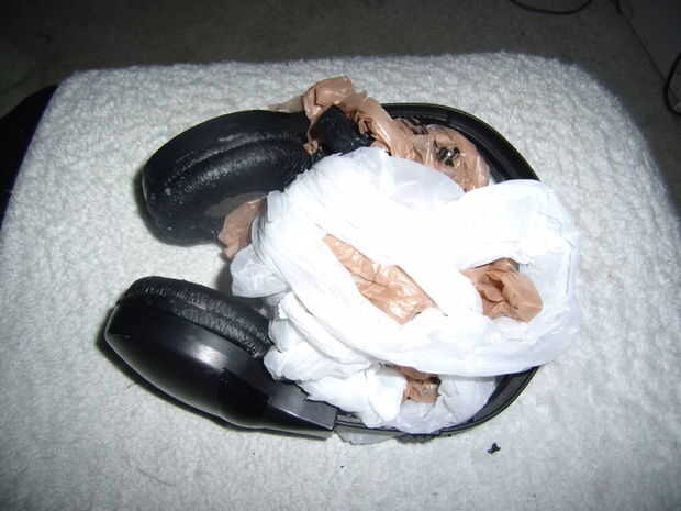 Lo que hice fue la bola de bolsas de plástico de unos 10. También se utiliza una bolsa de plástico que era casi del mismo tamaño que los auriculares. Puse los auriculares en la bolsa y luego rellenas las bolsas de plástico para hacer la forma de la cabeza. Sólo tomé los bordes de la bolsa para atar en un nudo para cerrarlo apagado.