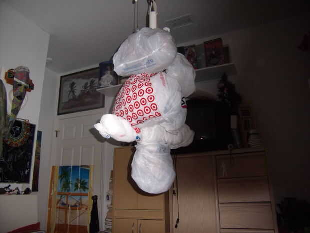 Perforar 2 orificios en la parte inferior de la tubería y un cable para colgar de, y ahora es la parte superior del cuerpo. Llené bolsas más con más bolsas y atado alrededor del tubo para hacer la mayor parte del cuerpo. No cosas estas bolsas llenas porque quería ser capaz de formar el cuerpo y no tiene demasiado aterronado. También utilicé bolsas blancas en el exterior para que no le muestran color a través del papel de la alcantarilla. Yo también envuelto los hombros para bulto para arriba y suavizarlos.