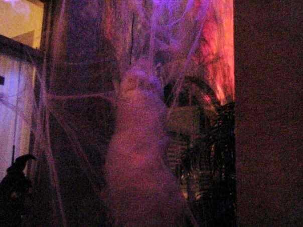 aquí es una manera de hacer una pantalla animada de Halloween, usando sobre todo cosas que ya tienen alrededor de la casa. Funciona la pantalla con un pequeño motor eléctrico conectado a la rueda trasera de mi bicicleta, y ataduras a los pedales tir