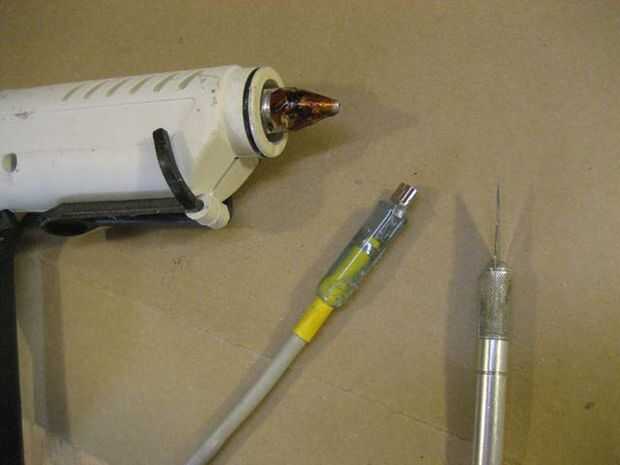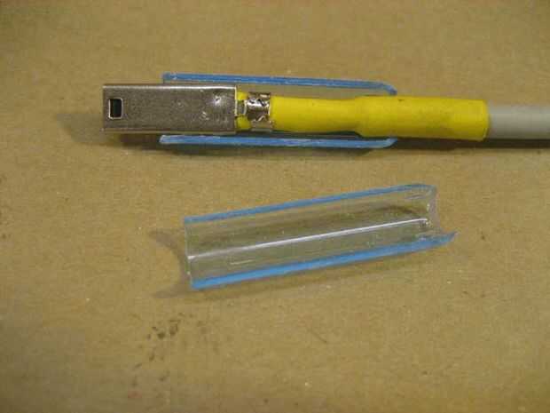 Use una tapa de pluma y vi por la mitad. A continuación llenar ambas mitades con pegamento caliente y adjuntar alrededor del conector. Hace que un cuerpo de conector grande que ayuda a mantener la tensión de los empalmes de la soldadura.