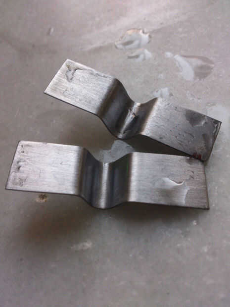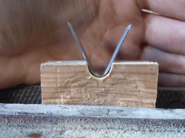 Para hacerlo más fácil que he hecho un molde con un ladrillo de utilizado madera y mis joyeros Sierra, luego coloque la tira de metal perpendicular a la cavidad y presione con una varilla de acero, cuando está en y sigue presionando doble los lados y con algunos golpes suaves con el martillo alinearlos, así puedo obtener dos piezas idénticas.