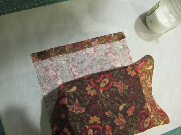 Cuando tienes un lado ir, cortar la longitud de la tela de modo que después de doblar un poco sobre el final traslapará el borde inicial.  Utilice el pegamento para "hem" en el borde y luego se adhieren a esa última parte de la tela a la caja.  Asegúrese de presionar firmemente en ese extremo doblado y use un poco extra pegamento para fijarlo.