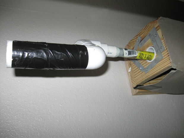 Os adjunto la manija al tubo con pegamento y un epóxido. Parece aguantar bastante bien, así que no creo que va ser que añadir a él. Apuntalado mi caja en unas sillas para probar mi mango. Cuando lo probé, era fácil de girar y parece funcionar bien.