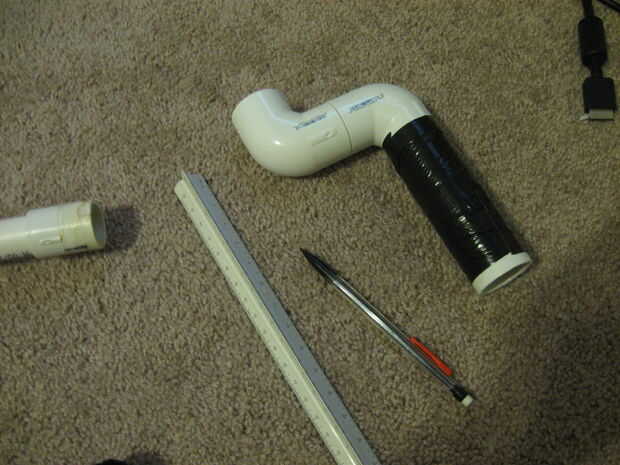 usé las instalaciones de tuberías de PVC para juntar un mango. De esa manera podría envolver y desenvolver la trama verde mucho más fácil. He formado el mango con unos trozos recta corta de tubería y algunas tuberías de ángulo derecho. Lo pegué todos juntos y poner alguna cinta en el extremo de un agarre.