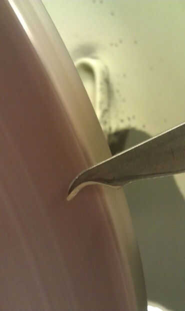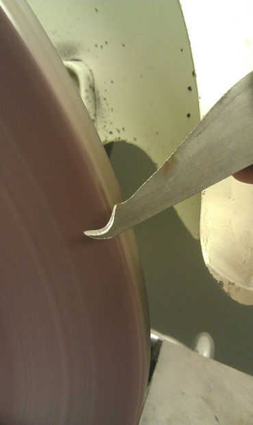 De todos modos, exponer el borde de la lijadora de disco - esto es cómo molemos un filo cóncavo. Mantenga su trabajo a un ángulo con la lijadora; vas a utilizar (suavemente) el borde del disco de lija. El movimiento es girar la pieza mientras tira de izquierda a derecha - ver las fotos. Esto requiere práctica y un poco intuición.