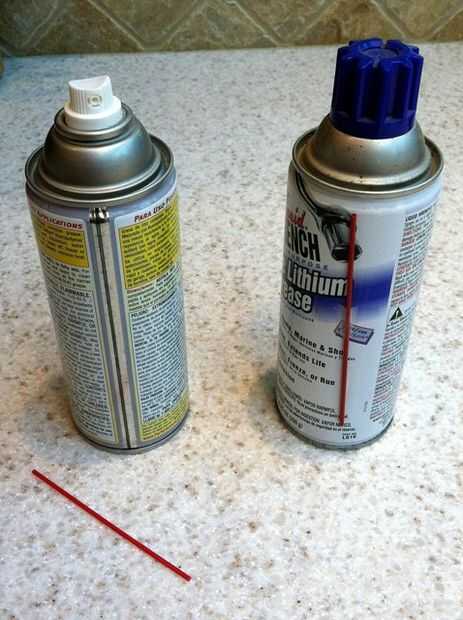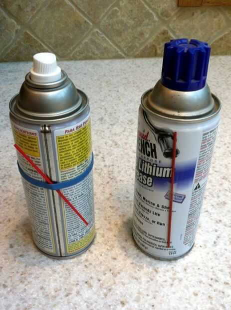 - Use una banda elástica. OK pero, ahora usted tiene que encontrar el tamaño adecuado - o - usar dos bandas de caucho más conseguirá la boquilla fuera de la alineación con la poder entonces atrapar en algo cuando intenta almacenar la lata. (FYI - la banda de caucho en la foto es de productos de la tienda de comestibles).