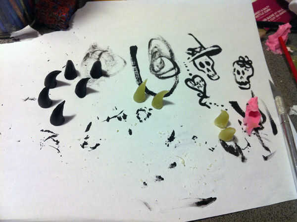 Las garras se hicieron al igual que la máscara! De derecha a izquierda, tenemos un pequeño molde de silicón rosado de una uña esculpida y algunas garras de resina cruda, algunos arena garras y por último los pintado finales. No hacer un mothermold para estos chicos porque estaban tan ligera y pequeña y la silicona tan gruesa.