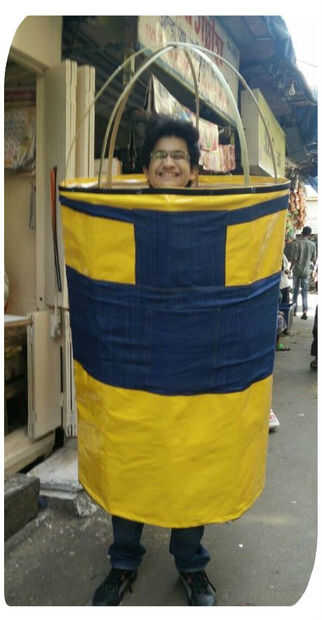 Una vez que esta pieza de tela rectangular, planificar dungaree de su súbdito (uso del dril de algodón para que se vea auténtica) y cortar los agujeros que usted necesita para la boca y los brazos.