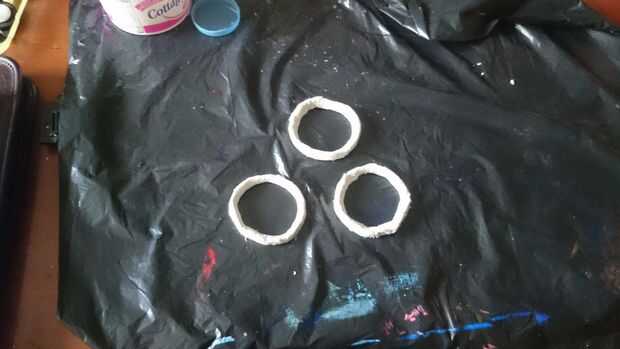 Aquí puedes ver algunos unos anillos que hice para ayudar a construir la forma alrededor de las aberturas de los ojos y boca de la máscara. Al horno les hasta duro antes de usar.