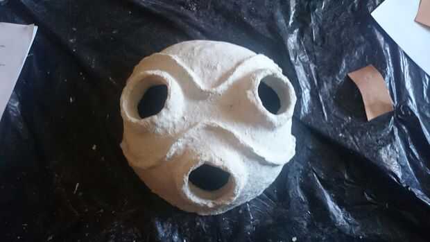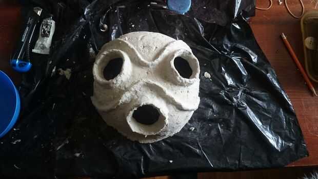 Aunque no se muestra, el proceso de cortar los ojos y los orificios de la boca de la forma de la máscara es bastante fácil. Utilizando un compás, trazar los orificios, luego corte los orificios utilizando su hoja de talla de madera. Un proceso tan simple y automático que incluso me olvidé de tomar una foto (bonita excusa).