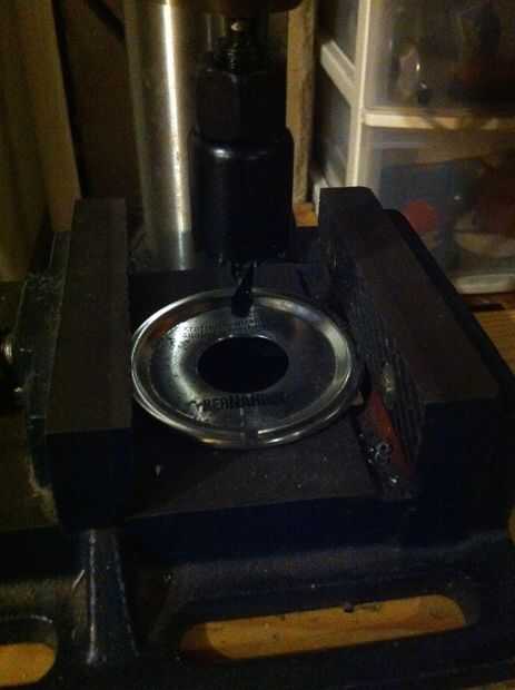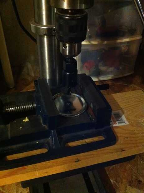 A continuación, sujete la tapa y perfore un agujero donde marcaste la tapa. Utilicé una prensa del taladro, pero fácilmente puede utilizar un taladro de mano. La parte más importante es la pinza porque de lo contrario su tapa solo comenzará a girar tan pronto como usted intente perforarlo.