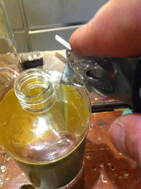 Ahora, utilice su hobby o cuchillo de corte de caja para cortar el cuello de su botella dispensador de jabón plástico, dejando un poco de material adicional alrededor de la base.
