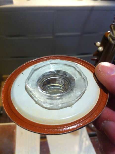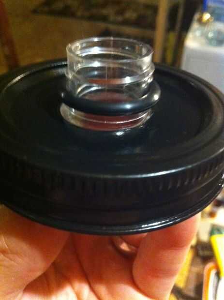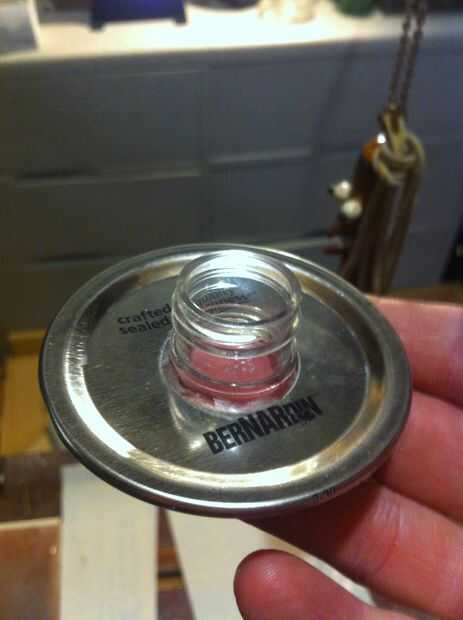A continuación, necesitará pegamento caliente el cuello de botella de plástico en la parte inferior de la tapa del tarro de masón. En primer lugar, introducir el cuello en el agujero perforado y luego caliente encolarla desde la parte inferior.