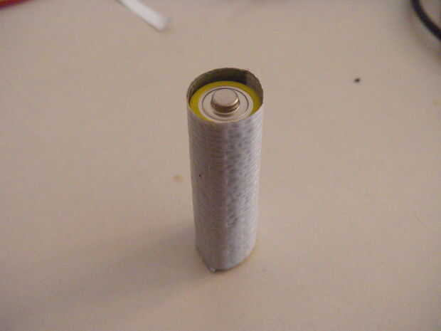 Anchura de la cinta del conducto es generalmente el tamaño de una batería AA. Si no es el caso, simplemente corte la cinta.