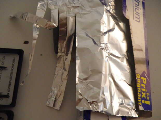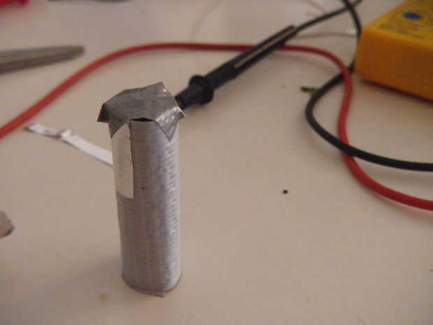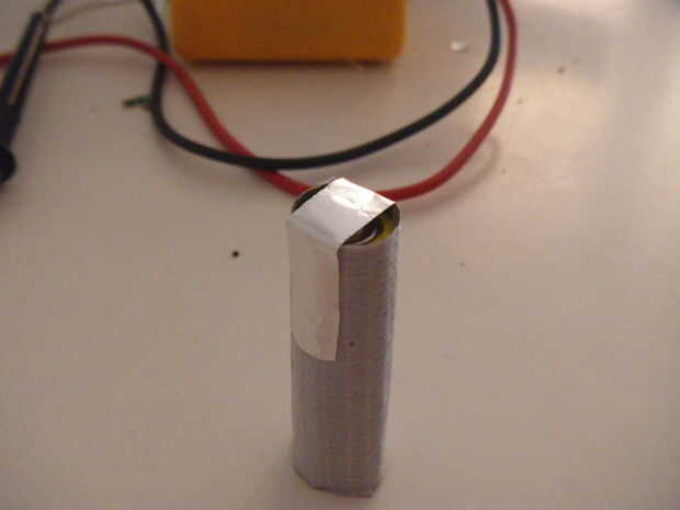 Cortar bandas de aluminio. Mientras que la batería está dentro del rollo de cinta, pega una banda de aluminio en el lado positivo y añadir un trozo de cinta para mantener esta banda siempre en el lugar.