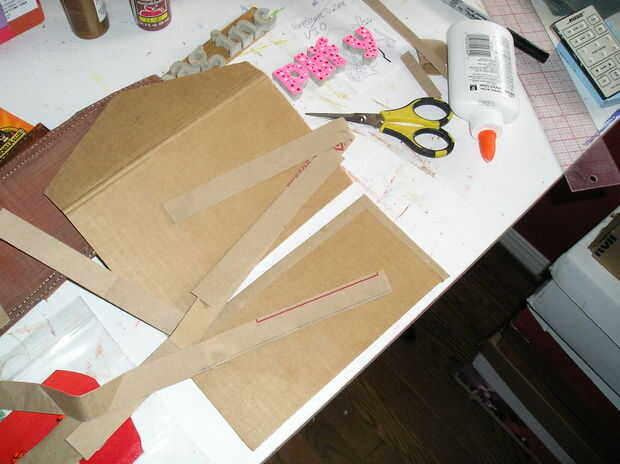 Cortar varios pedazos de papel kraft 3/4 de pulgada. Esto se dobla por la mitad, equipada para las piezas de cartón de la bolsa y pegado en su lugar.