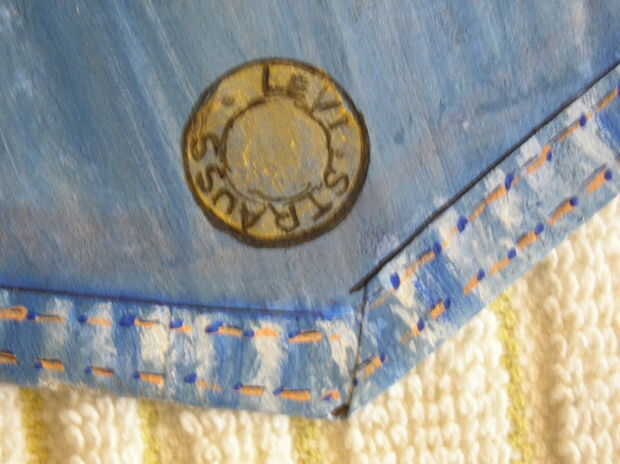 , pinté los remaches con naranja y Siena quemado. Una sombra se dibuja con el marcador negro para dar la apariencia de una sombra. Para el botón de cierre, se utiliza una plantilla para dibujar un círculo negro, luego rellena con una pintura de oro. Se agrega Letras: Levi Strauss... bastante apropiado.