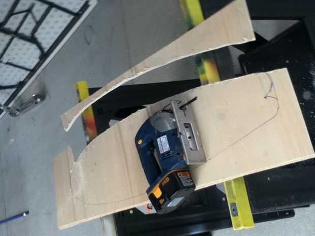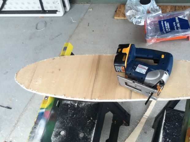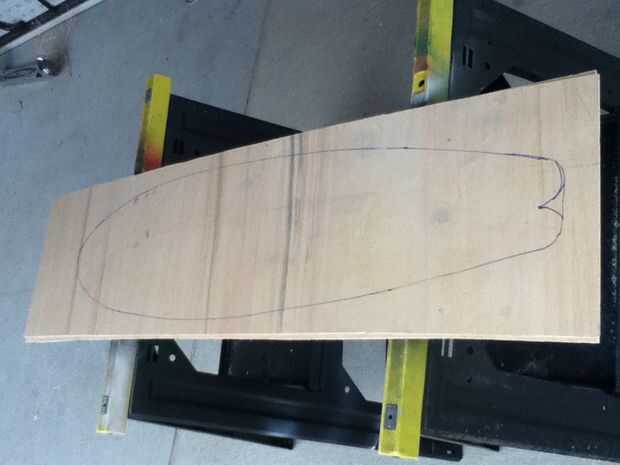 Ahora que el pegamento se haya secado, saque las abrazaderas, y poner el tablero ahora sólida sobre el caballete. hice una plantilla para mi diseño, pero puede optar por hacer eso o poner un tablón largo en su frente y trazar en el tablero. De cualquier manera funciona y usted puede hacer cualquier forma que desee más o menos, como se marca una línea de centro, que será muy útil más adelante. Usar la sierra caladora para cortar lo se indica. una vez que se ha cortado, utilice la lijadora para suavizar los bordes y la superficie.