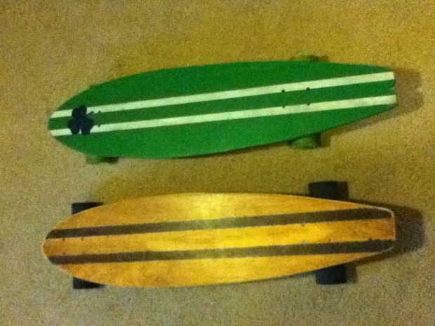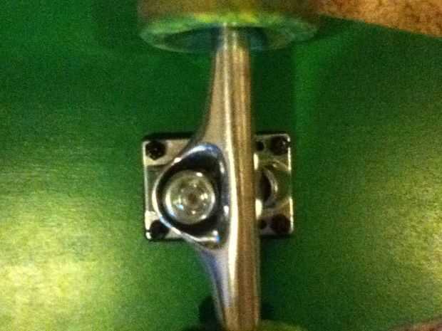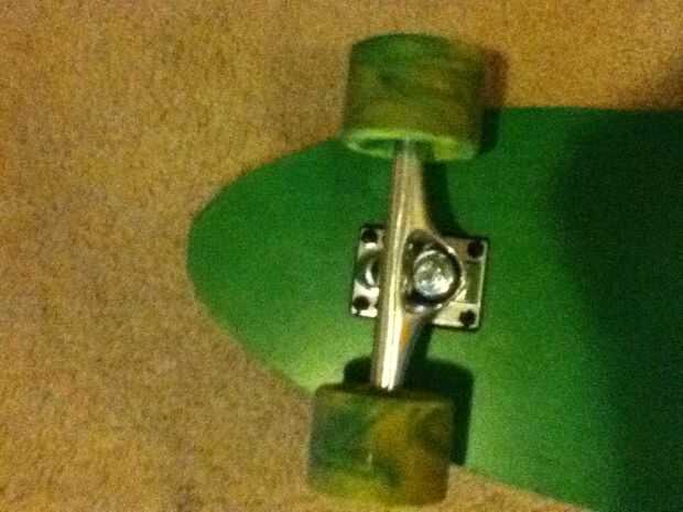 finalmente es el momento de añadir las ruedas. Lo primero que tienes que hacer es encontrar la línea de centro del tablero, si no haces este comienzo midiendo el ancho en algunos lugares, y poniendo una marca en el medio. Une todos estos puntos con una línea y es su línea de centro. Cuando usted recibe sus camiones de ebay, mida el ancho de los camiones y la mitad de los camiones de la marca con un marcador. Hacer esto para ambos carros. La parte delantera de los camiones frontales son cerca de 4 pulgadas desde la parte superior y la parte trasera de los camiones detrás sobre 7 o 8 pulgadas desde la parte inferior. Establece que los camiones donde tienen que ir y usarlos como plantilla para marcar los agujeros para los pernos, marque los orificios, luego taladre el agujero, todos los 8 de ellos. Perno en los camiones, luego colocar el rodamiento y ruedas. Que acaba de hacer un tablero largo, salir y montarlo! he hecho unos 5 hasta ahora y ninguno nunca vienen cerca de última hora y cada una es única, incluso mi hermano hizo su propia que lo utiliza! Ahora vaya y haga su propio! Ah y cuando ponga su dominación en el frente del pie, empuje con la otra, después pone ambos pies en para que sean perpendiculares a la línea central, divertirse y estar a salvo!