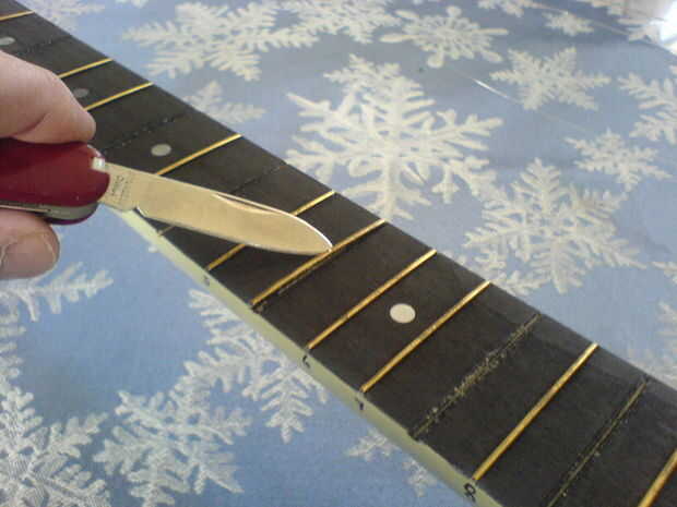 Necesita quitar algunos trastes para dar el Dulcitar la escala diatónica. Usé un cuchillo de bolsillo para anotar a lo largo de los costados de los trastes que me iba a quitar para que sean fáciles de quitar. Va quitando los siguientes trastes, comenzando con el primer traste más a la tuerca ser número 1.