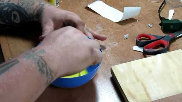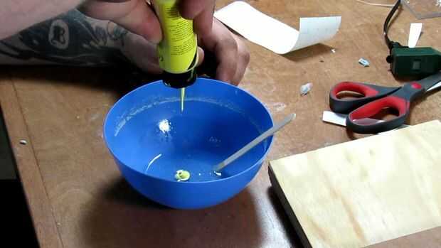 Hay muchos tipos diferentes de resina disponibles, así que no entraré en detalle sobre la mezcla, pero corre a través de los conceptos básicos. Utilizamos una resina epoxi de dos partes llamada Famowood esmalte capa. Está específicamente diseñado para bares y tapas de tabla, pero funciona muy bien para fundición y aplicaciones como esta. Se mezcla en partes iguales, pero puesto que cada tipo de resina es diferente, asegúrate de que comprobar las instrucciones de la marca que tienes en la mano. Para añadir color a la resina que utilizamos pintura arte de acrílico estándar. Pintura acrílica a la resina de color funciona muy bien para esta aplicación, pero no lo recomendamos para otros proyectos. Si usted está llenando algo, como estamos para este proyecto, funciona muy bien. Y, por supuesto, estamos utilizando amarillo para el rayo.