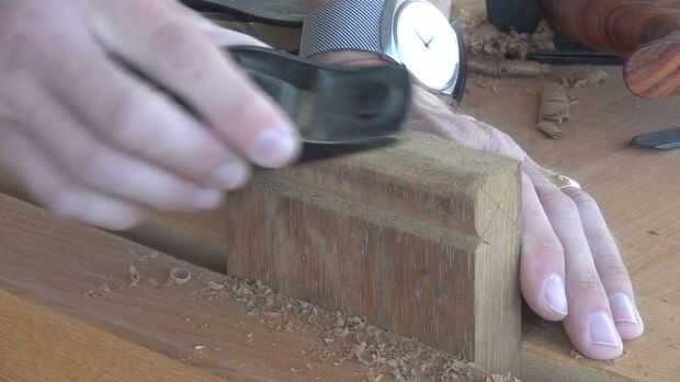 Los extremos de los cilindros de nudillo entonces pueden ser cepillados a los círculos marcados. Pare o plano de un bisel en el extremo antes de cepillar, para evitar la ruptura. Un plano de bloque es ideal para este trabajo. Empezar por cepillado de las esquinas de 90 grados, entonces los ángulos de 135 grados que produce, etc. hasta crea el perfil del cilindro.