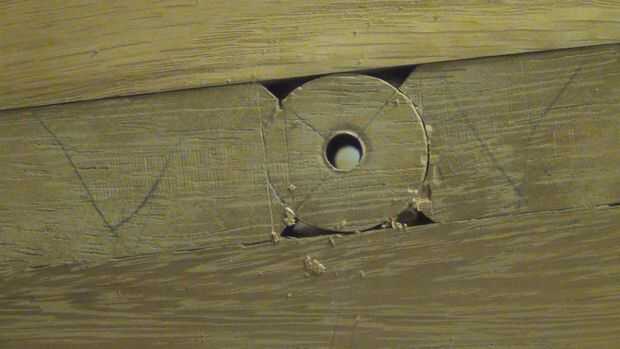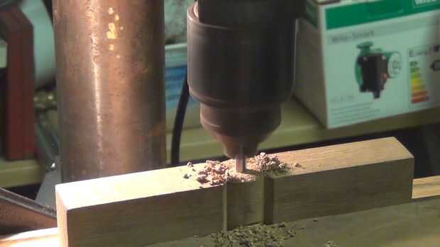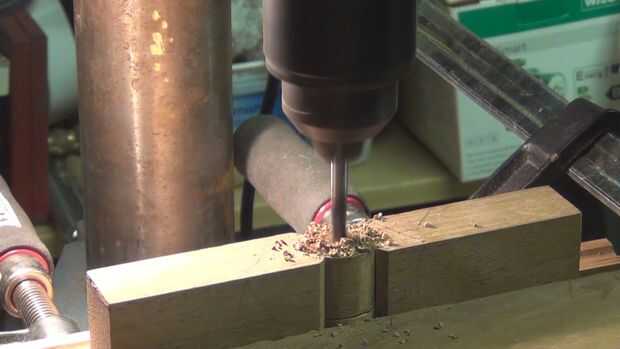 Con el empalme alineado y estrecho bien, taladro para el pasador de la bisagra, a medio camino de un lado y mitad del otro. La intersección de las diagonales da el punto de centro, y un poco de punto de brad facilita la ubicación.