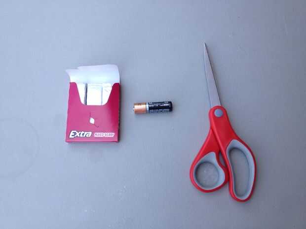 Sólo un par de tijeras, una pila AA y una envoltura de goma con un lado de papel de aluminio o metálico. Tenga en cuenta que esto no funcionará con una envoltura de goma sólo de papel. Algunas clases de goma que tienen envolturas parcialmente metálicos son "Wrigley 5" y "Extra".