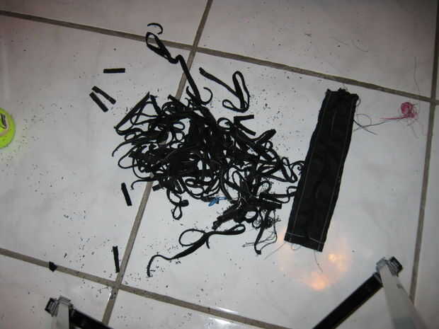 Una vez termines con los ocho vas a recortar alrededor de la mitad la longitud del material de los bordes de los brazos y las piernas. Después de haber cortado los bordes en exceso, el material tendrá que ser sacudido/limpiar ya que va derramando un montón de material. Recomiendo hacerlo fuera o sobre una alfombra donde se puede fácilmente ser aspirar porque las cosas se pondrán muy desordenadas.