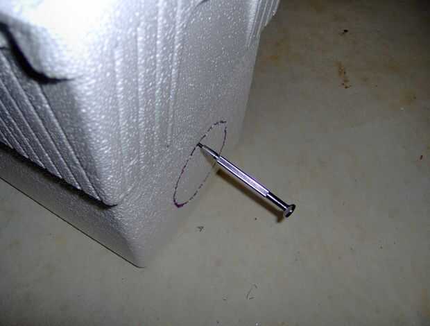3. Empuje el destornillador y la cadena a través de la espuma de poliestireno