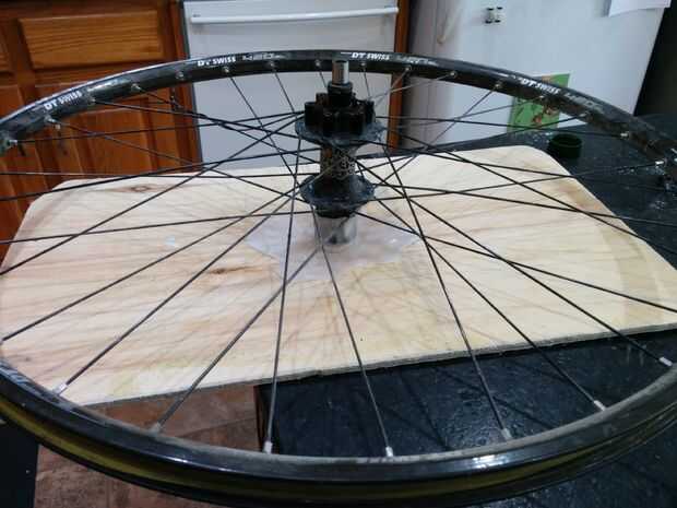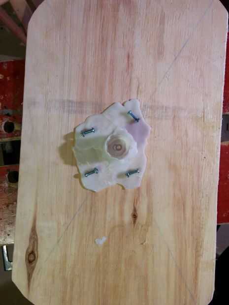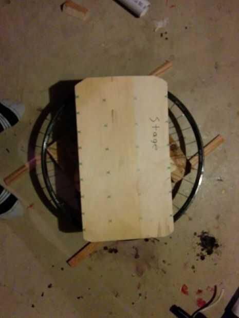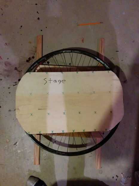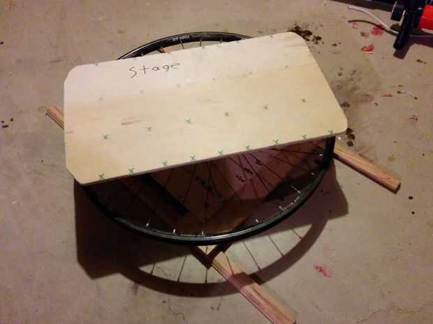 simplificar este paso por la rueda los bancos boca abajo y colocar las ranuras del cubo en un hueco especialmente diseñado en la base. Entonces podría unir la etapa atornillando los agujeros que normalmente acomodar un disco de freno.