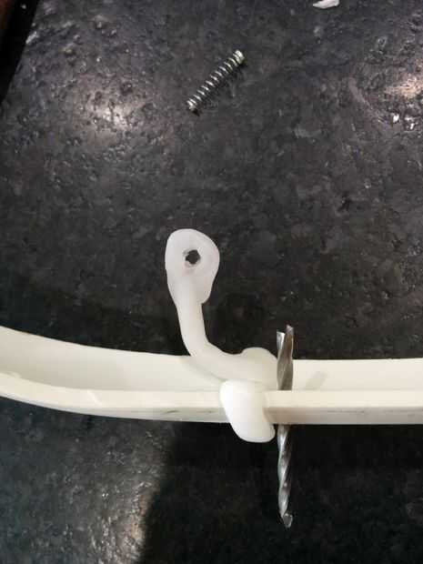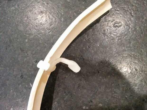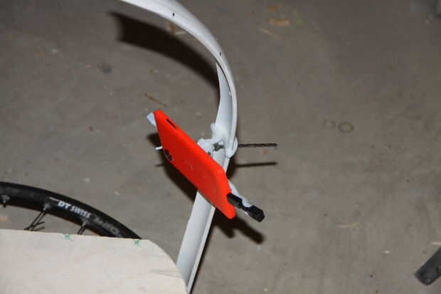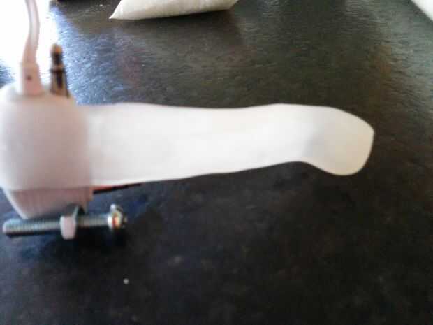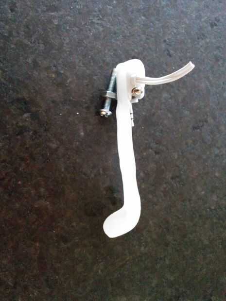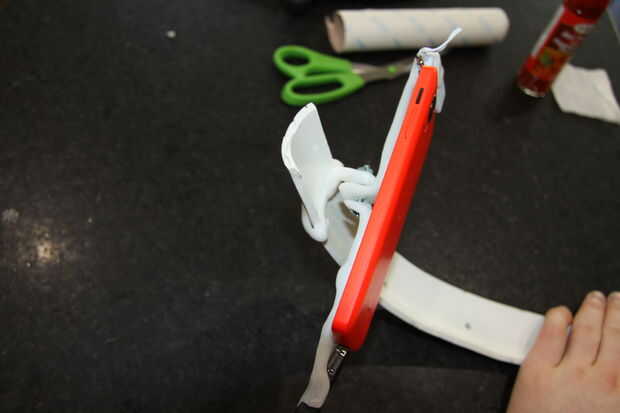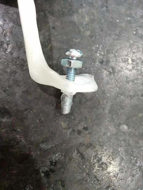 La siguiente pieza se conecta con el tubo que envuelve el PVC se extiende y conecta con el perno que une las dos piezas que sostienen el teléfono. Estirar el otro tubo de plástico y aplanar un extremo. Utilizando el método había descrito anteriormente perforadora un agujero del mismo tamaño que el perno este extremo aplanado. Luego conecte el otro extremo al anillo alrededor de la PVC, fundir ambas piezas un poco para asegurar una conexión sólida.