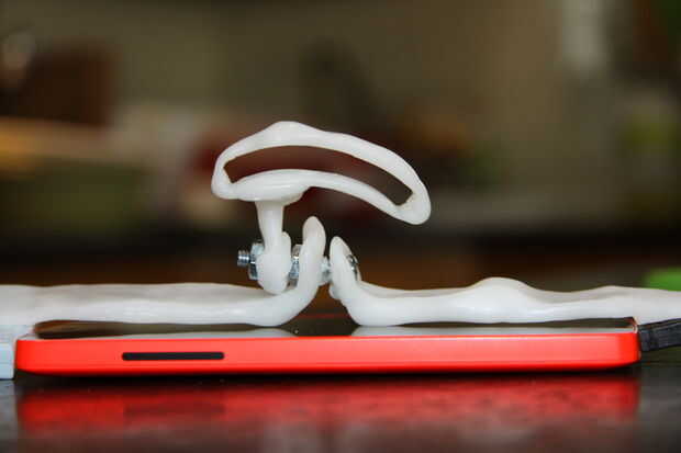 Otra vez usé el plástico de moladable de mano para hacer una pieza que tendrá mi teléfono en el "tronco". Se fija en un extremo un conector para auriculares y por el otro por un conector mini usb de un viejo cargador de teléfono. Las dos piezas se apretaron con un tornillo. La otra pieza se conecta a este mismo tornillo y usa otra tuerca para asegurarlo. Este paso va a ser un poco diferente para cada teléfono, pero el mismo tipo de sistema funciona en la mayoría de los teléfonos. Mientras la salida de auriculares y puerto de carga en los extremos opuestos del teléfono.