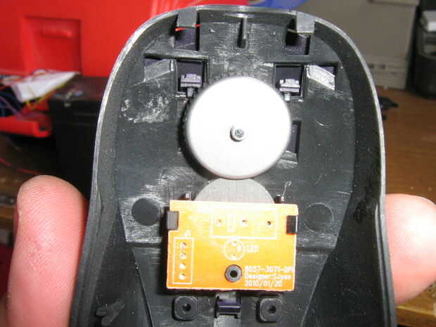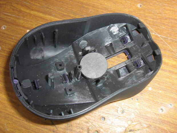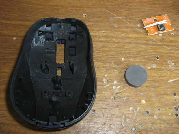Recuerde el circuito superior, te dije que mantener? Bien, retírelo y coloque el imán. Ahora, fije el circuito otra vez. Compruebe que el imán es lo suficientemente fuerte como para atraer clips a través de la caja de plástico de ratón.