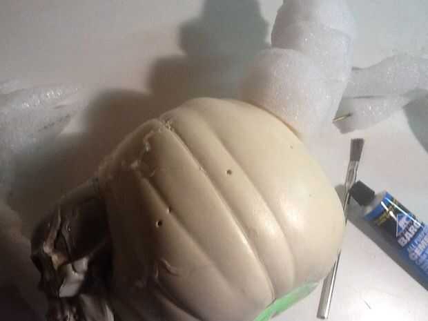Cuando todas las partes están utilizando completa barcaza o pegamento caliente Monte las patas a los lados del monstruo. Ayuda a empujar los agujeros donde usted quiere las patas y garras.