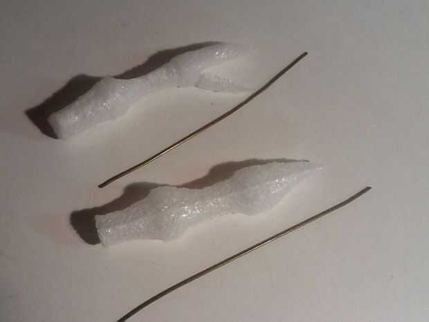 Una vez que haya cada pierna a tu gusto, cortar las perchas de alambre en secciones de 12". Estas se utilizarán para dar la forma de las piernas y la fuerza. Se deslizó una sección de soporte en el centro de cada pierna dejando el exceso sobresale. Si el cable no va recto solo retroceda y vuelva a intentarlo. Una vez que cada pata tiene una percha entonces puede formar la pierna a la forma.