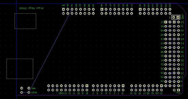 El escudo que se muestra aquí tiene orificios que coinciden con los pines en el Arduino Mega 2560 R3. Hay un juego extra de pastillas para hacer conexiones de alambre si es necesario. Diseñé utilizando el software gratuito de Diptrace (altamente recomendado!). Para utilizar esta plantilla, descargar e instalar Diptrace, luego Descárgate el escudo aquí: http://lightboxkit.com/Mega%20Shield.dip