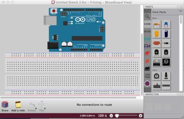 http://fritzing.org/download/ y descargar la aplicación de prototipado de fritzing. Después de descargar lo abro (en un mac será bajo descargas). Encontrar la parte de Arduino Uno en la sección de piezas base y arrástrelo a la placa.