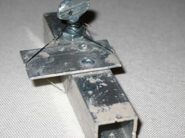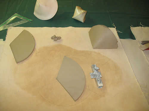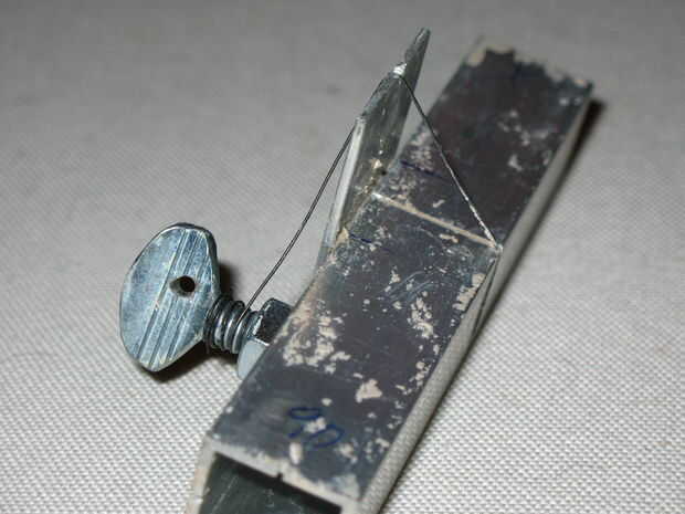 Estoy utilizando una herramienta casera, tal vez voy a a la construcción de un instructivo en algún día. Hay un par de cerca fotos debajo de mi herramienta casera. Brevemente, se construye de dos piezas de aluminio con un alambre en el ángulo deseado. El fondo plano de la herramienta se monta sobre la superficie de trabajo. El lado plano paseos a lo largo de la losa precortada de arcilla. El alambre se extiende hacia fuera al rodaja en el borde de arcilla en el ángulo correcto.